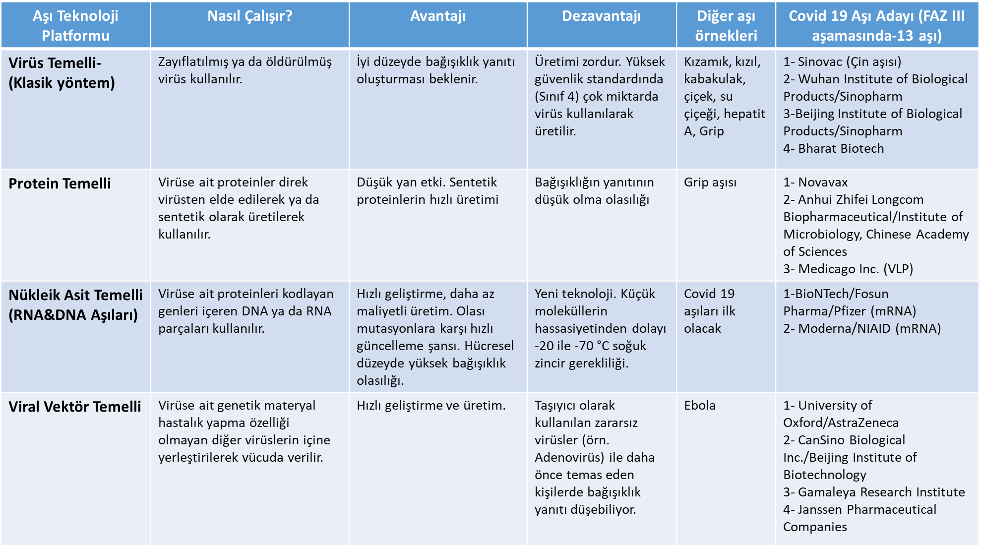 5 Ocak 2021 itibarı ile klinik çalışma aşamasına geçmiş 60 aşı ve henüz klinik öncesi çalışamaları süren 172 aşı bulunmaktadır. Covid 19 pandemisi sürecinde geliştirilen aşılardan 13 aşı onay sürecinin en önemli aşaması olan Faz 3’ e ulaştı ya da tamamladı. Bu aşılar farklı geliştirme teknolojileri ile geliştirildi. Aşağıdaki tablo bu aşıların özelliklerini ve geliştirme teknolojilerini özetlemektedir (4).