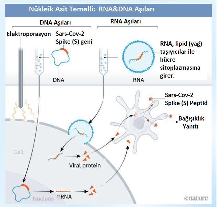 Diğer bir nukleik asit temelli aşı olan, RNA aşıları (mRNA aşıları da diyebiliriz) üzerine çalışmalar 1989 yılında Salk Enstitüsünde başlamıştır. Bu teknoloji bağışıklık oluşturulması için belirlenen virüs proteinini mRNA aracılığıyla hücre içerisinde üretmek üzere tasarlanmıştır. Ancak bu mekanizmanın hücre içine sokulması ve bağışıklık oluşturmasının sağlanması büyük teknik problemleri barındırmaktaydı. İşte bu zorlukları 1990’lı yıllarda Macar bilim insanı Katalin Kariko ve Amerikalı bilim insanı Drew Weissman yaptıkları öncü çalışmalarla aşmışlardır. mRNA teknolojisi bu yıllardan itibaren başta kanser hücrelerine karşı vücudu eğitmek olmak üzere, bazı kronik hastalıklar için geliştirilmeye çalışılmaktaydı. Bu bilgi birikimi ve teknolojik gelişmişlik mRNA teknolojilerini Covid 19 için aşı olarak tasarlanması ve geliştirilmesini mümkün kılmıştır. FDA ve EMA başta olmak üzere bazı ülkelerde acil kullanım onayı alan iki mRNA aşısı- Biontech ve Moderna aşıları- %95 üzerinde etki ve yüksek güvenilirlik profili ile pandemi ile mücadelede insanlığın en önemli umutlarından olmuştur. mRNA aşıları insan hücresinde üretilmesi hedeflenen protein için gereken genetik kodları bir lipid kapsülü içerisinde hücreye göndermeyi, hücrenin sitoplazmasında bu proteinin üretilmesini ve virüsün bu proteini sayesinde de bağışıklık sistemini eğitmeyi hedeflemektedir. Bu aşı teknolojinin sağladığı bir avantaj da virüsün mutasyon sonucu değişime uğraması durumunda aşı da hızlı bir şekilde yeni virüse göre güncellenebilecektir.