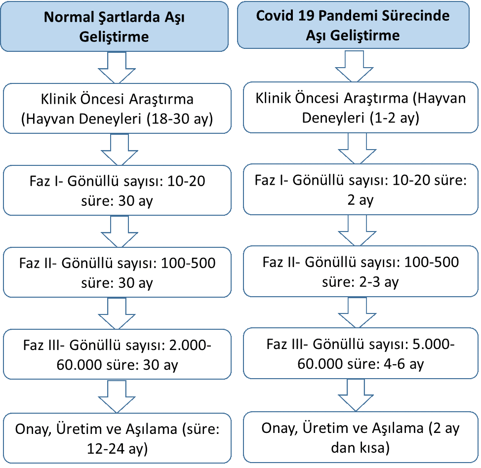 Tüm aşı ve ilaç çalışmaları onay aşamasına gelmeden önce laboratuvar çalışmaları, klinik öncesi çalışmalar (preklinik/hayvan deneyleri) ve üç ayrı fazdan oluşan klinik çalışma süreçlerinden geçer. Norma şartlar altında bir aşı geliştirilmesi en az 4-5 yılı bulur. Ancak pandemi gibi tüm dünyanın bir anlamda kilitlenmesine neden olan olağanüstü durumlarda bu sürecin nasıl kısalabildiğini, bilimsel seferberliğin aşı geliştirilmesini nasıl hızlandırdığına şahit olduk. Normal şartlar altında bir aşının geliştirilmesi aşamalarını ve gerekliliklerini, Covid 19 aşı geliştirme süreçleri ile karşılaştırdığım tabloyu aşağıda inceleyebilirsiniz. Tabloda da görüldüğü gibi çalışmaların süreleri çok kısa olsa da çalışmaya katılan gönüllü sayısı ve çalışmaların tasarımı açısından gerekenler kriterler yerine getirilmiştir.